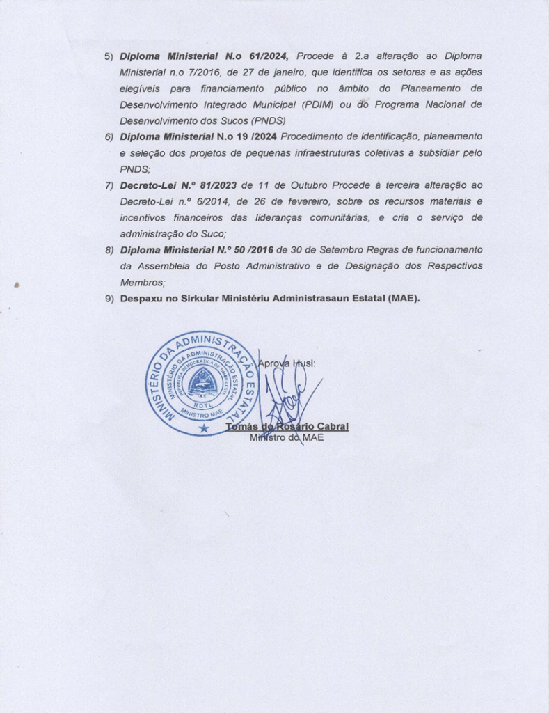 • Planu dezenvolvimentu munisípiu hetan aprovasaun hosi Konsellu Ministru, liuhosi rezolusaun Governu nian, tuir proposta hosi membru Governu responsável ba área administrasaun estadu nian.
