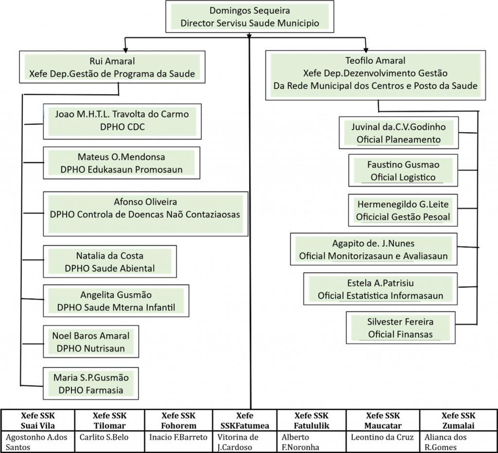 Diresaun Servisu Municipal Saude Covalima Lidera husi Diretor ( SMS) Ne’ebe Responsabel maksimu Dirasaun Diretamente ba Presidente Autoridade Muncipio Covalima.
