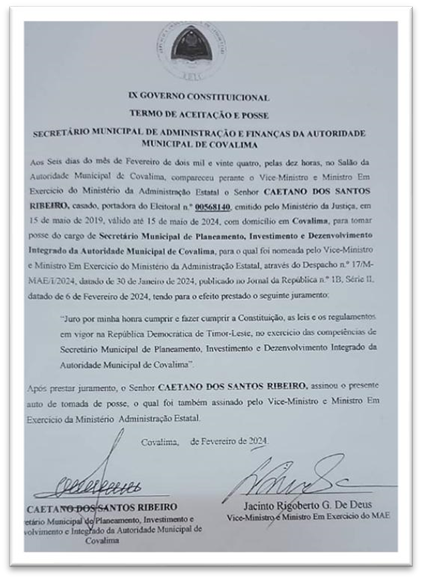 • TERMO DE ACEITAÇÃO E POSSES, HUSI IX GOVERNO CONSTITUICIONAL: Sekretáriu Munisípiu ba Planu no Investimentu Dezenvolvimentu Integradu Autoridade Munisipál Covalima nian, ne’ebé nia hetan nomeasaun husi Vise-Ministru no Ministru Interinu husi Ministériu Administrasaun Estatál, liu-husi Despaxu Nú. 17/ M-MAE/1/2024, loron 30 fulan-Janeiru tinan 2024, ne’ebé públika iha Jornál Repúblika no.1B, Série II, ho data 6 Fevereiru 2024.