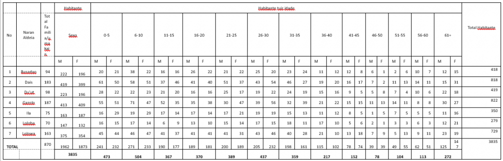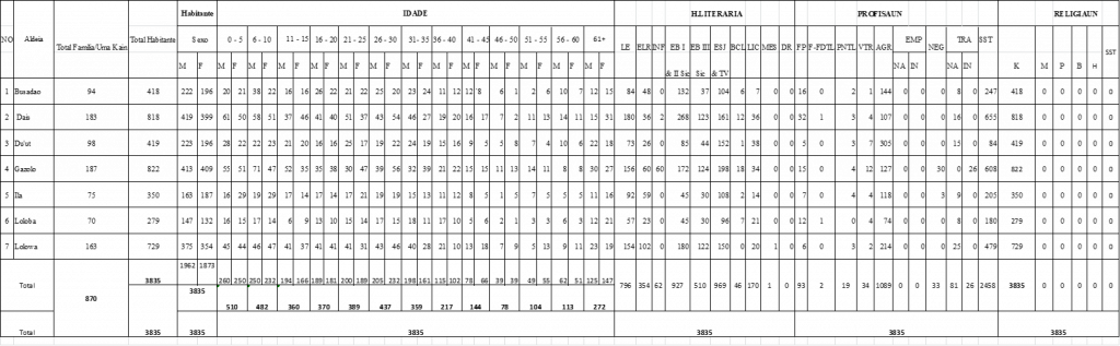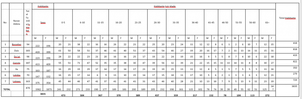 Aldeia hira                         :7(Busadao,Dais,Du’ut,Gazolo,Ila,Loloba,Lolowa.