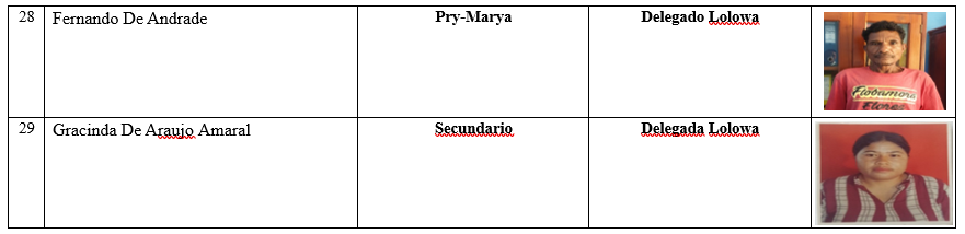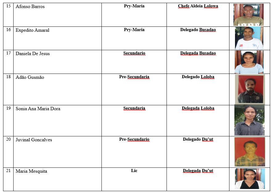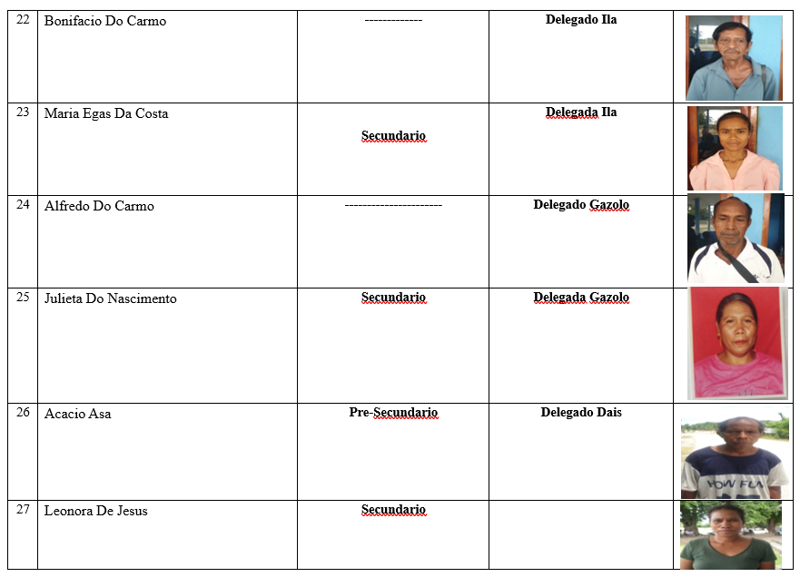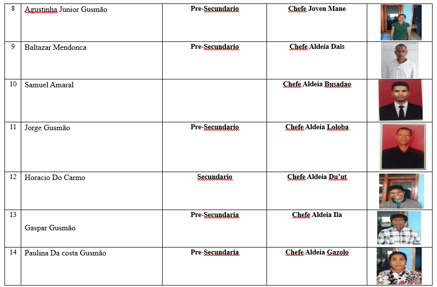• Chefe Aldeia:Kompetebsia mak promove komprimentu husi  membru sira husi aldeia Pas no Establidade Social,Partisipa Aktivu iha Reniaun Membru konselhu suku,fo informasaun no dokumneto neebe nia husu.