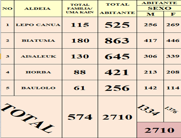 aumenta ona e antes ne’e suku Lepo iha deit aldeia ha’at mak hanesan (Aldeia Lepo Canua, Aldeia Urluli(Aldeia Aisaleuk) Aldeia Biatuma no Aldeia Horba)