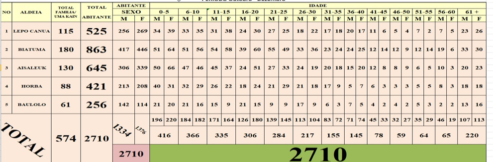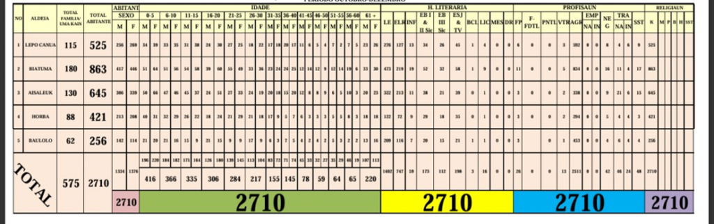 | 4 | Francisco | 1960 ba leten | La deskobre | Populasaun balu hahu eskola onaPopulasaun balu komes ahalo to’os iha parte tetuk (Raimea) |