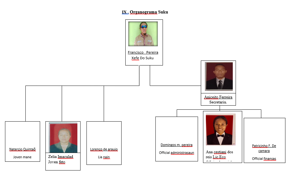 Suku hirarkiamente servisu tuir ninia tarefa ne’ebe iha xefe do suku atu tau matan no kontrola membrus konselus suku sira no funsionario apoiu suku  tuir ida –  idak nia area servisu , tuir relatorio xefe aldeia sira submete dadus mai iha