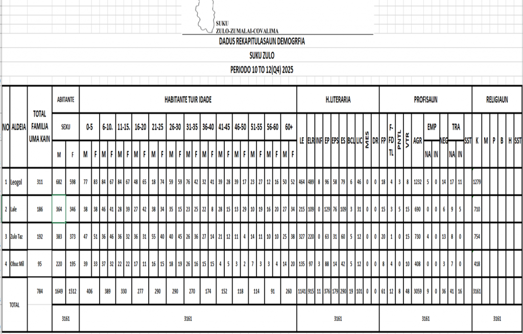 Sucu zulo kompostu husi aldeia 4  total Populasaun 3,109 hanesan tuir mai ne’e